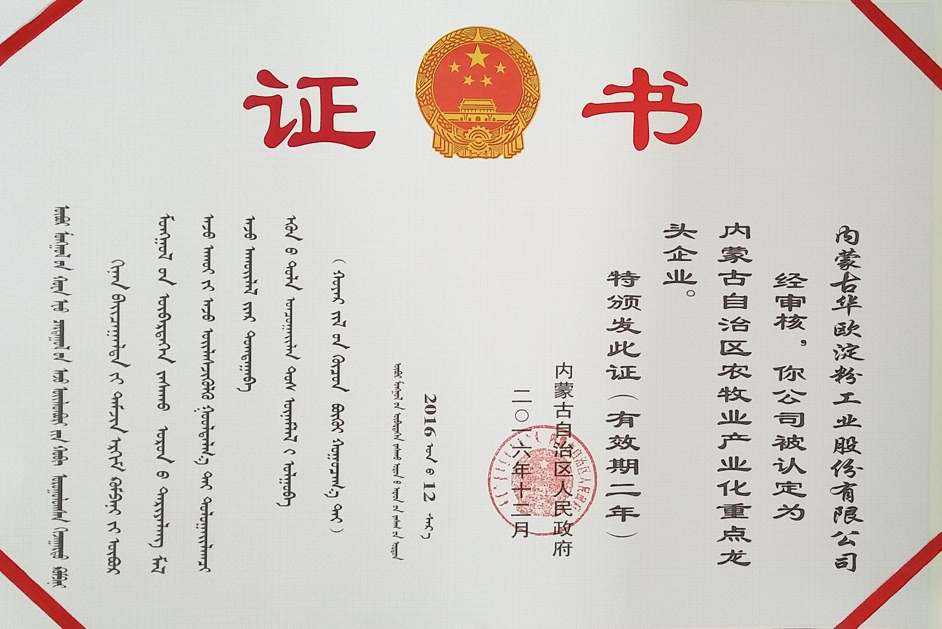 2016年12月,華歐公司被內(nèi)蒙古自治區(qū)人民政府認(rèn)定為“內(nèi)蒙古自治區(qū)農(nóng)牧業(yè)產(chǎn)業(yè)化重點龍頭企業(yè)”。