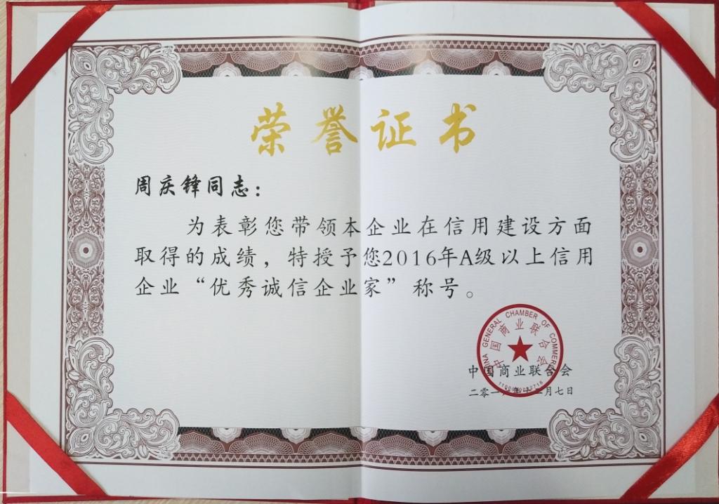 2016年12月7日,華歐公司董事長周慶鋒被中國商業(yè)聯(lián)合會授予2016年A級以上信用企業(yè)“優(yōu)秀誠信企業(yè)家”稱號。